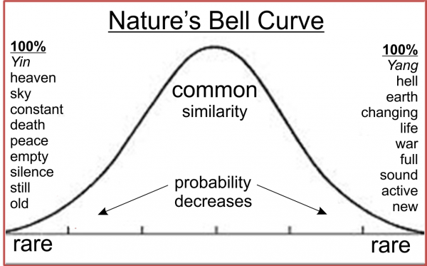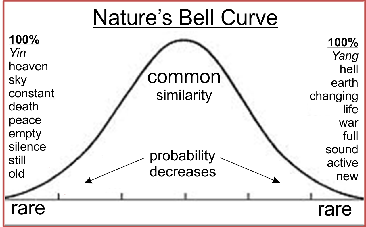 The bell curve (graphic above) can be a broader way to view nature. There are two rather rare extremes, a total Yin on one side and a total Yang on the other, with most all aspects of nature sharing a kind of middle ground between these extremes. Our ability to recognize the complementary quality of nature’s entangled reality is weak, to say the least. You can’t have one side without the other, as chapter 2 observes…