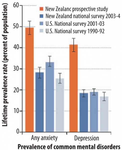 “Some mental disorders aren’t merely common—they’re the norm”, or so a recent Science News article, Rates of common mental disorders double up, reports. Note the tallest bar in the graph showing a recent prospective study of 1000 New Zealanders assessed for mental disorders eleven times between the ages of 3 and 32.