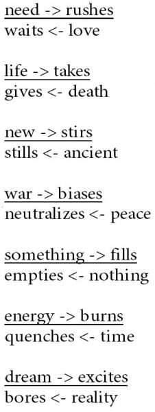 Consider these Correlation pairs(2). The active, or yang, are on top; the passive, or yin, are on the bottom. The word love, as it is often used, correlates more to the active side; truer love would correlate more to the passive side. These can be read in a clockwise direction. For example, the first set reads thus: need rushes love; love waits need. The next set reads: life takes death; death gives life. To make sense of these connections, it probably helps to have your mind like that of a fool – how blank!, as chapter 20 puts it.