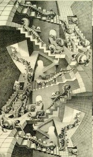 Human imagination is both a valuable survival asset and the source of lingering anxieties. Ironically, imagination also promises us ways to quell these anxieties. I say promises because fulfillment canāt truly be possible. This peculiar dynamic reminds me of the Mƶbius like geometry of Escherās Waterfall.